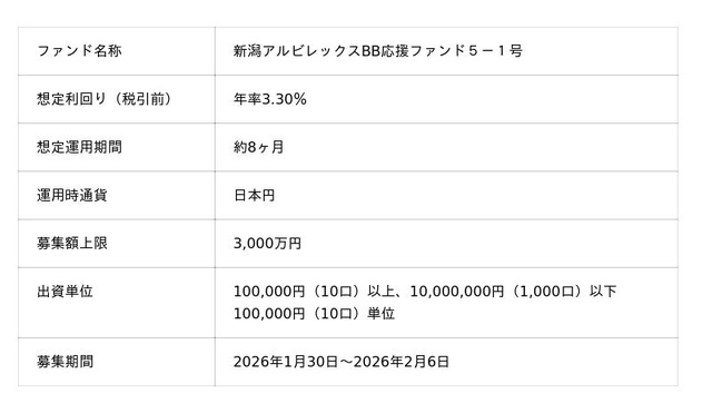 「未来をわかちあう投資」を提供する「Funvest(ファンベスト)」(以下、Funvest)は、「新潟アルビレックスBB応援ファンド5-1号」(以下、本ファンド)の募集を1/30より開始しますので、お知らせいたします。