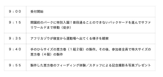 開園前の静かなパークに特別入園し、アフリカゾウが寝室から運動場へ踏み出す瞬間を観察いただけます。さらに、アフリカゾウの長寿を支える「食事」についてスタッフからのレクチャーを聞いて、手のひらサイズの恵方巻と白菜を丸ごと1玉使った特大恵方巻を手作りし、アフリカゾウへ直接プレゼントしていただきます。