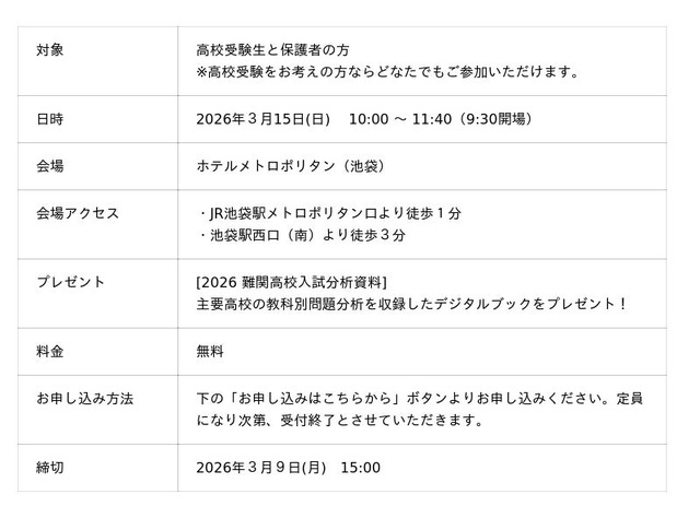 株式会社リソー教育グループ(本社:東京都豊島区、代表取締役:天坊真彦)の子会社である、株式会社TOMAS(本社:東京都豊島区、代表取締役:町田仁)は、2026年3月15日(日)に、「難関高校入試最新分析報告会 2026」を開催いたします。