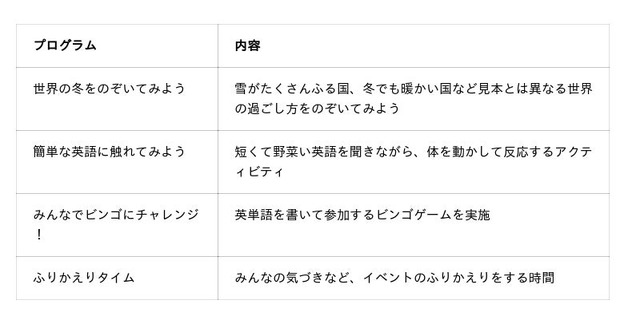 本イベントは、英語を話したり覚えたりする場ではありません。「世界の冬」をテーマに、クイズやゲームを交えながら、楽しみながら世界を知る体験を行います。