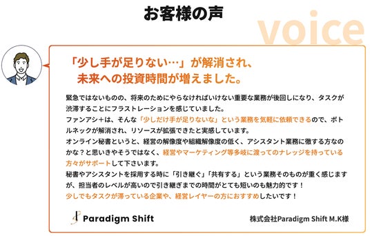 ファンアシ+をご利用いただいたお客様からは、次のような声が寄せられています。「作業に追われていた状態から抜け出し、前向きな業務に時間を使えるようになった」