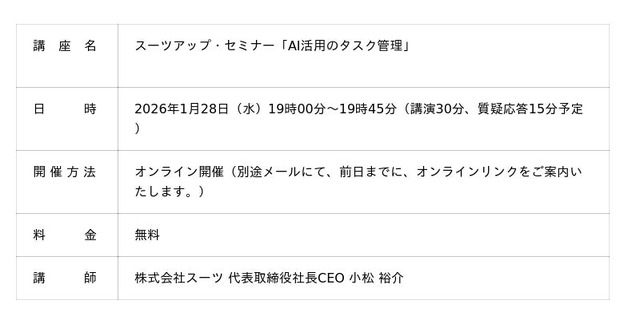 当社では、2026年1月28日(水)19時から、当社代表の小松が講師を務めるスーツアップ・セミナー「AI活用のタスク管理」を無料開催します。