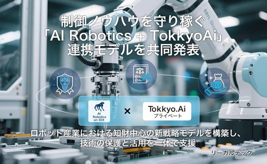 リーガルテック株式会社(東京都港区:代表取締役 平井 智之、以下リーガルテック)およびAIデータ株式会社(東京都港区:代表取締役 佐々木 隆仁、以下AIデータ)は、生成AIによるナレッジ統合基盤「AI Robotics on IDX」と、発明・特許・知財プラットフォーム「Tokkyo.Ai」を連携させた、ロボット産業向け知財戦略モデルを共同で発表する。本モデルは、ロボット企業が保有する制御ノウハウや操作データを知財資産へ転換し、ライセンス収益化を可能とする仕組みを提供するものである。