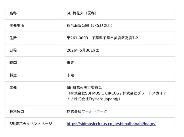 「SBI舞花火(仮称)」は、千葉市・稲毛海浜公園にある、いなげの浜が開設50周年を迎えることから「いなげの浜50周年記念」として開催を予定しています。花火と音楽を1/30秒単位で高度にシンクロさせた演出による次世代の花火エンタテインメントです。「SBI MUSIC CIRCUS」と「GREAT SKY ART」がタッグを組み、圧倒的な没入感を生み出します。音・光・空間演出が一体となった、単に“観る”だけではない、五感で楽しむ特別な花火体験をぜひお楽しみください。
