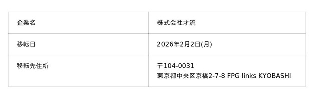 株式会社才流は、2026年2月2日(月)に東京都中央区京橋2-7-8 FPG links KYOBASHIへの移転を行います。新オフィスでは、移転同日から業務を開始し、お客様へのサービス提供を継続いたします。