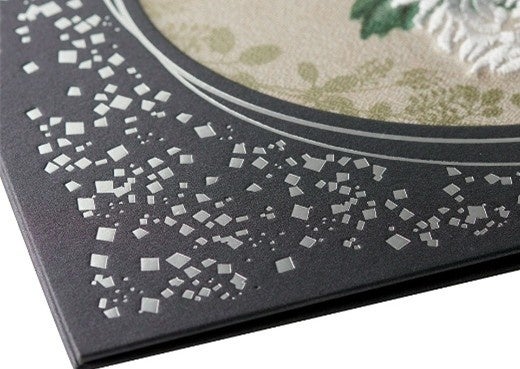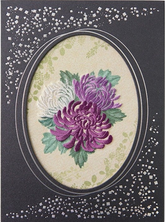 本商品は、大きく花びらを広げた3輪の菊を、美しい刺しゅうで表現した電報台紙です。