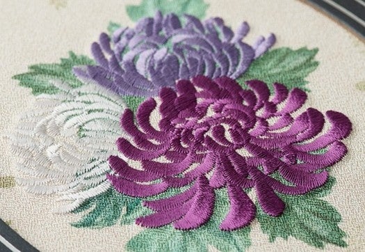 3輪の菊の刺しゅうには、濃紫、薄紫、白の糸を使用し、上品な色合いに仕上げました。