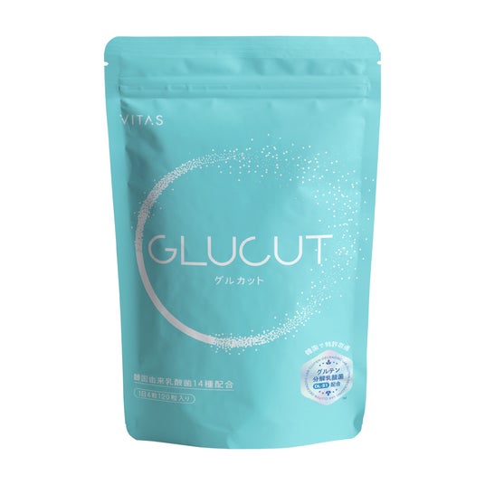 「GLUCUT(グルカット)」は、1日4粒(目安)を食後に飲むだけで、腸に溜まったグルテンを最大約 70% 分解(※1)。飲むだけのお手軽な新習慣が、「食べたいものは変えずに、カラダにもいいことをしたい!」という望みをサポートします。