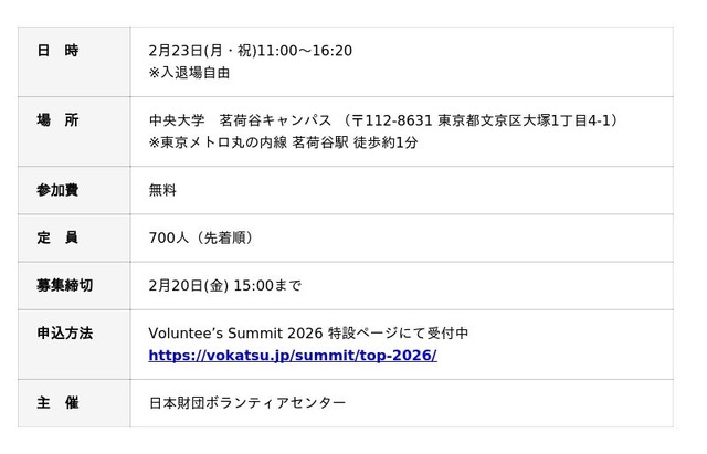 日本財団ボランティアセンター(以下日本財団ボラセン、東京都港区、会長 山脇 康)では、2月23日(月・祝)に開催するカンファレンス&アワードセレモニー「Volunteer’s Summit 2026」の参加者を募集しています。