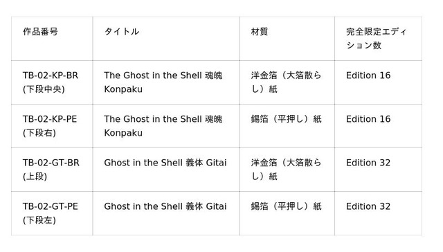 漫画原作扉絵のフチコマに搭乗する草薙素子をあしらったTB-02-KP(魂魄)と、95年アニメ映画版のワイヤーを接続した草薙素子のビジュアルを用いたTB-02-GT(義体)の2つの絵柄を、洋金箔、錫箔の2種の箔で表現した、計4種のラインナップです。