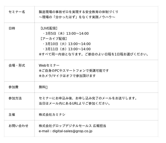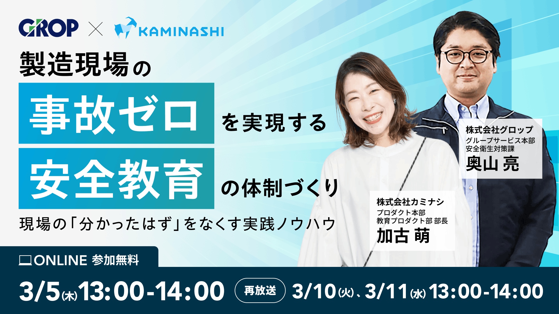 人材サービス事業を展開する[株式会社グロップ](本社:岡山県岡山市、代表取締役社長:原田 竜一郎)は、2026年3月5日(木)に開催される企業人事総務・安全衛生担当者向けウェビナー、『製造現場の事故ゼロを実現する安全教育の体制づくり~現場の「分かったはず」をなくす実践ノウハウ~』に登壇いたします。本ウェビナーでは、これらを現場マネジメントの一貫した流れとして設計することで、派遣社員を最大限に活かし、貴社の生産性を高める具体的なアプローチなど実践的なヒントをお伝えします。