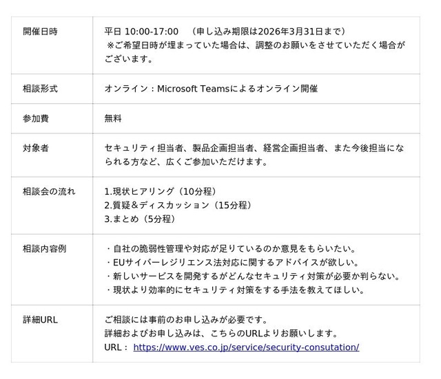 ソフトウェアの第三者検証により企業の品質向上を支援する、株式会社Orchestra Holdingsの子会社である株式会社ヴェス(本社:東京都渋谷区、代表取締役:中村 慶郎、以下ヴェス) は、サイバーセキュリティ対策に関する疑問や不安をお持ちの企業を対象に、各種セキュリティ診断やEUサイバーレジリエンス法(CRA)などの品質規格対応に関する相談、その他サイバーセキュリティ対策全般について幅広く無料で相談できる「セキュリティ個別相談会」を2026年3月末(申し込み期限)までの期間限定で開催いたします。