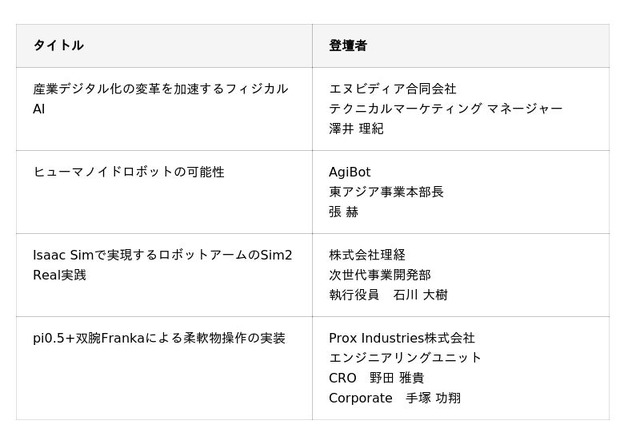 昨年はAIエンジニアやR&D部門の方など100名以上の方にご参加いただきました。今回は内容をアップデートし、ヒューマノイドロボットの展示や、ロボットシミュレーションの最新事例紹介など、より実践的かつ製造現場の未来を体感いただけるプログラムです。