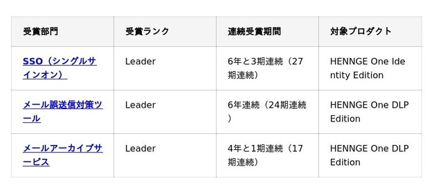 受賞は「SSO(シングルサインオン)」「メール誤送信対策ツール」「メールアーカイブサービス」の3部門です。