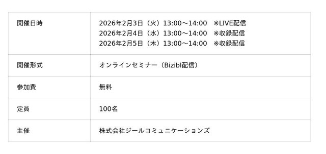 株式会社ジールコミュニケーションズ(本社:東京都渋谷区、代表:薮崎 真哉)は、2026年2月3日(火)13:00~14:00、4日(水)13:00~14:00、5日(木)13:00~14:00におきまして【なぜ“内部トラブル”は晒されるのか? 若者のSNS行動から読み解く組織リスクの変化】と題したオンラインセミナーを開催いたします。