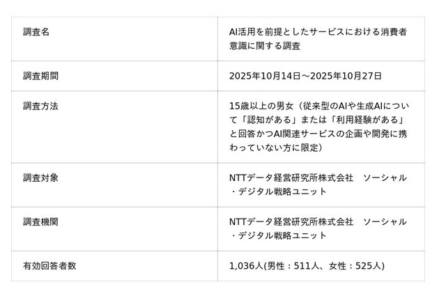 NTTドコモビジネスX株式会社(旧:NTTコム オンライン、本社:東京都品川区、代表取締役社長:稲葉 秀司、以下NTTドコモビジネスX)は、株式会社NTTデータ経営研究所(本社:東京都千代田区、代表取締役社長:山口 重樹、NTTデータ経営研究所)と共同で、NTTコム リサーチ登録モニターおよび協力企業を対象に「AI活用を前提としたサービスにおける消費者意識に関する調査」(以下、本調査)を実施しました。
