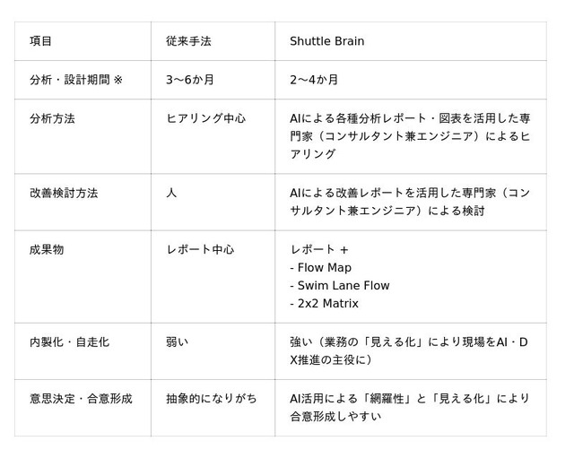 Shuttle Brainは従来手法に比べて現状把握と改善検討にかかる時間を短縮し、意思決定を加速させます。また、可視化された客観的な図表に基づいて関係者が議論できるため、心理的安全性の確保に寄与します。その結果、認識のズレをなくし、スムーズな合意形成を進めることが可能になります。