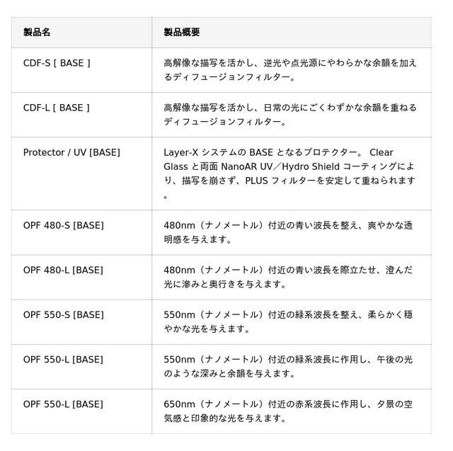 Layer-X は、常用できるベースフィルターと、必要な表現だけを重ねる効果フィルターを組み合わせるレイヤー構造を採用したレンズフィルターシステムです。