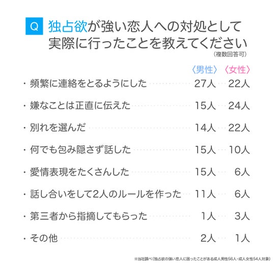 設問2で「困った経験がある」と回答した成人男女110人(男性56人/女性54人)に「独占欲が強い恋人への対処として実際に行ったことを教えてください」と尋ねたところ、上位は「頻繁に連絡をとるようにした」「嫌なことは正直に伝えた」「別れを選んだ」でした。