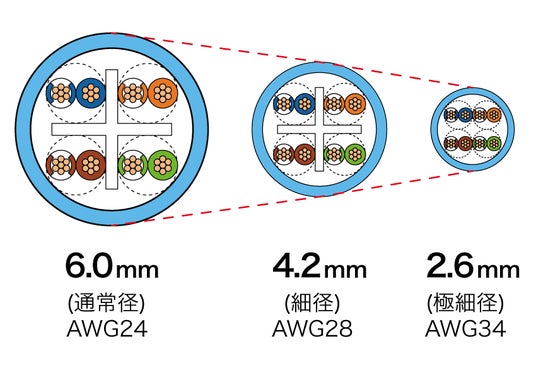 AWG34の導体を採用することによって、標準的なAWG24のLANケーブルと比較して約57%の細径化を実現。
