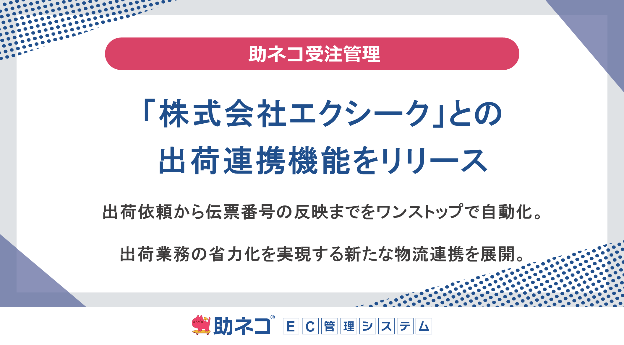 株式会社アクアリーフ(本社:神奈川県平塚市、代表取締役 長谷川 智史)が提供するネットショップ向け業務管理システム「助ネコ(R)EC管理システム(以下、助ネコ)」は、2026年1月27日に、フルフィルメント(EC物流)事業を展開する株式会社エクシーク(本社:東京都港区)との出荷連携機能を新たにリリースしました。