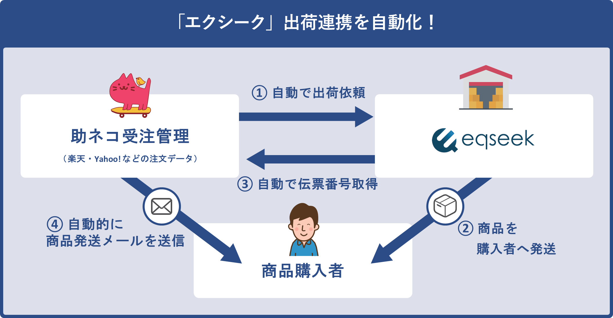 今回のリリースにより、助ネコユーザーは助ネコの管理画面からワンクリックでエクシークへ出荷依頼が可能となり、エクシークでの出荷が完了次第、助ネコ側に伝票番号が自動で返されます。これにより、従来必要だったエクシーク側の管理画面を挟むことなく、助ネコの管理画面からワンストップで出荷処理が完了します。