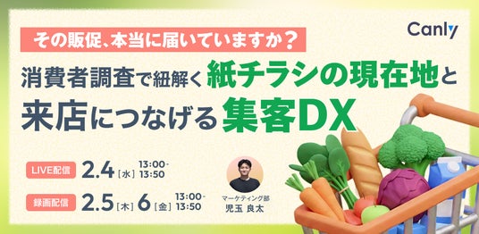 Google ビジネスプロフィール、Yahoo!プレイス、Appleマップなどの3大地図媒体、HP、アプリ、SNSなどの店舗集客媒体の一元管理サービス「カンリー店舗集客」の開発・提供を行う株式会社カンリー(所在地:東京都品川区、代表取締役:辰巳 衛,秋山 祐太朗)は2026年2月4日(水)・5日(木)・6日(金)の3日程でスーパー業界向けセミナー【その販促、本当に届いていますか? 消費者調査で紐解く「紙チラシの現在地」と、来店につなげるための集客DX】をオンライン開催いたします。