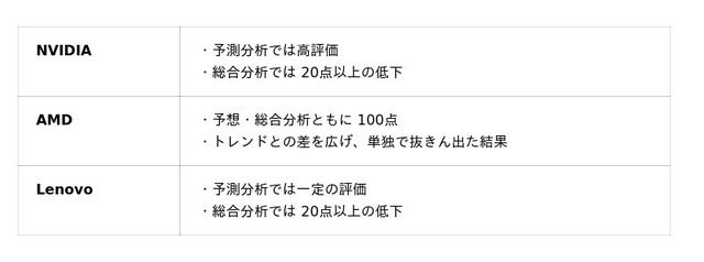 ■ 予測分析と総合分析の差が浮き彫りにした、NVIDIA/AMD/Lenovoのスコア変化