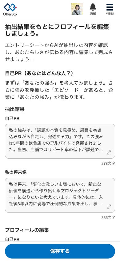 株式会社i-plug(大阪市淀川区/代表取締役 CEO:中野 智哉)が運営する新卒オファー型就活サービス「OfferBox(オファーボックス)」は、新機能「スマートプロフィール作成」を2026年1月27日(火)にリリースしました。当機能は、生成AIを活用し学生が作成したエントリーシート(以下、ES)からOfferBoxのプロフィール文を抽出し提案する機能です。