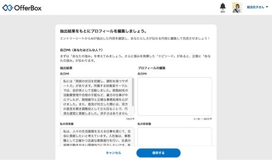 当機能の特徴はAIが創作するのではなく、個性を残した文章生成を提案することです。学生が書いた元の文章を極力変更せずに、OfferBoxのプロフィール項目に合わせた文章を提案します。