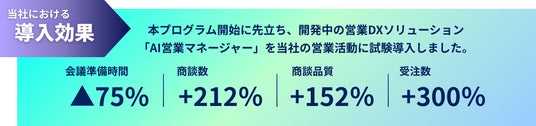 当社では、本プログラム開始に先立ち、開発中の営業DXソリューション「AI営業マネージャー」を社内の営業活動に試験導入しました。