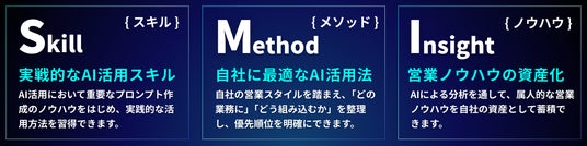 - 営業現場で使えるAI実践スキルの獲得:AI活用において重要なプロンプト作成のノウハウをはじめ、実践的な活用方法を習得できます。