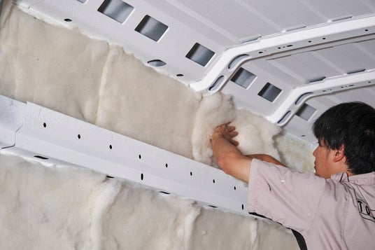 【製作途中】ジャパンキャンピングカーショーで展示予定の断熱体感車両。施工前後のキャンピングカーを左右で比較展示し、ご覧いただけます。