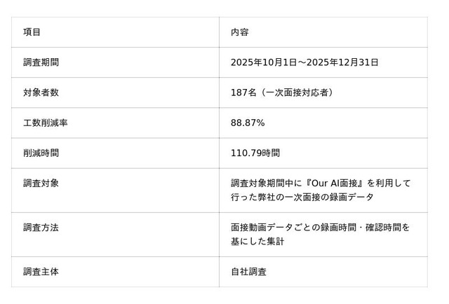 JetB株式会社(本社:東京都新宿区、代表取締役:竹内 勇人、以下JetB)は、自社開発のAI面接ツール『Our AI面接』を2025年10月から12月までの3ヶ月間実務に導入し、一次面接の工数削減効果の検証を行いました。187名の採用活動を実施した結果、従来と比較して88.87%の工数削減を達成し、AI面接の有用性を示しています。