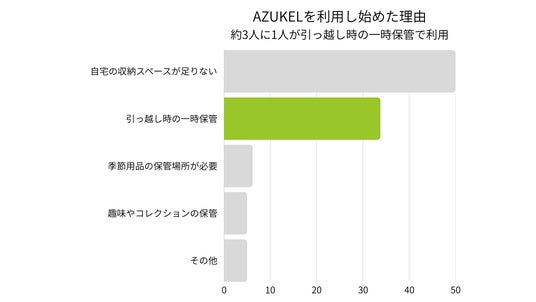 アズケルの利用を始めた最も大きな理由を尋ねたところ、最も多かったのは「自宅の収納スペースが足りない(50.0%)」でしたが、次いで「引っ越し時の一時保管」が33.8%と、高い割合を占めました。