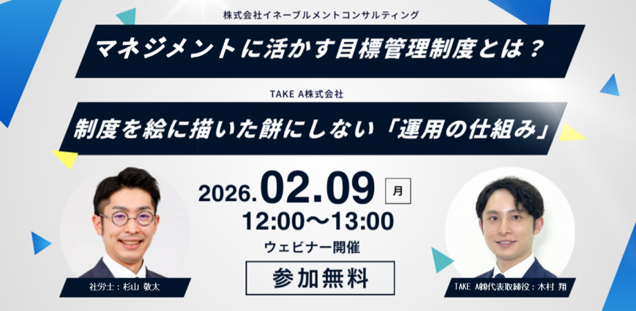 TAKE A株式会社(本社:東京都渋谷区、代表取締役:木村 翔、以下「TAKE A」)は、株式会社イネーブルメント・コンサルティング(本社:東京都港区、代表:田中 健治)と共催で、ウェビナー「マネジメントに活かす目標管理制度とは?」&「制度を絵に描いた餅にしない『運用の仕組み』」を2026年2月9日(月)12:00~13:00に開催します。