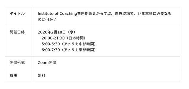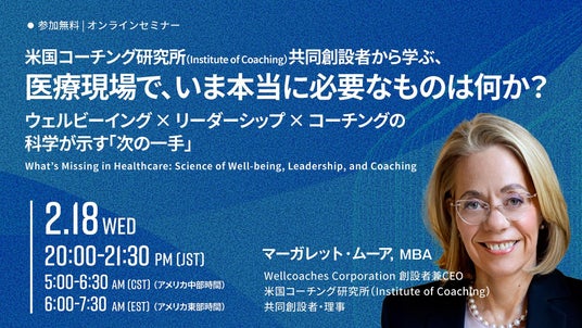 組織変革を実現するエグゼクティブ・コーチング・ファーム、株式会社コーチ・エィ(東証スタンダード9339)は、医療・ヘルスケア領域におけるコーチングの発展を世界的に牽引してきた第一人者であるマーガレット・ムーア氏をお迎えし、「Institute of Coaching共同創設者から学ぶ、医療現場で、いま本当に必要なものは何か?」をテーマにした無料オンラインセミナーを2026年2月18日(水)20:00-21:30(日本時間)・5:00-6:30(アメリカ中部時間)・6:00-7:30(アメリカ東部時間)で開催します。