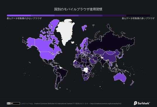 Surfsharkは、各国のユーザーが使用しているブラウザに基づき、どの国が最もプライバシーリスクが低いか、または高いかを分析し、それらの傾向を示す地図を作成しました。データ収集量の多いブラウザを使用する人口が多い国ほど、プライバシーリスクスコアが高くなります。