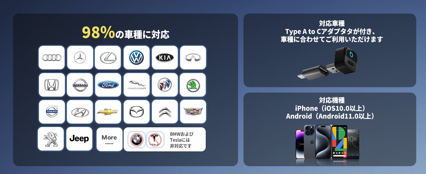 また、純正有線CarPlay/Android Autoを搭載したほぼすべての車種(約98%以上)でご使用いただけます。