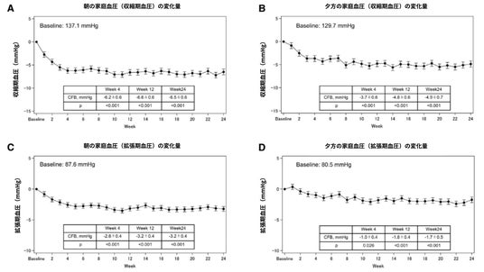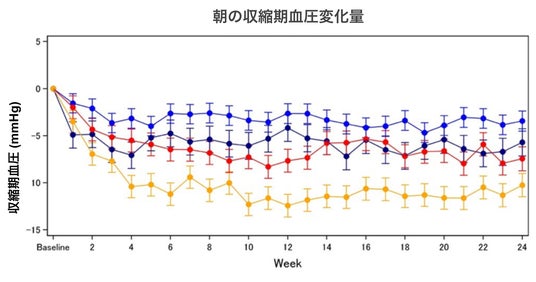 特に、「早期の減量」および「減塩」を達成した患者群では、治療開始後12週目に朝の収縮期血圧が12.4mmHg低下し、最も大きな血圧低下が認められました。