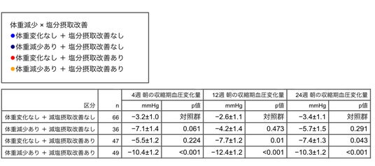 ※表は、基準値からの収縮期血圧(SBP)の変化量を各時点ごとに示し、対照群(体重変化なし・塩分改善なし)との比較におけるp値を併記する。
