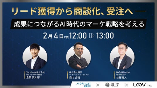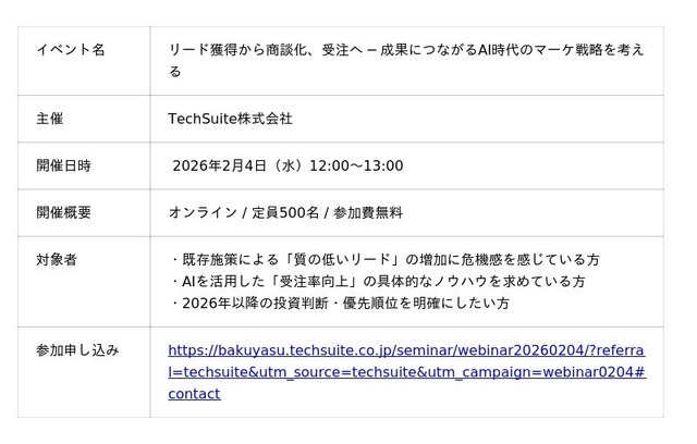 TechSuite株式会社(テックスイート/代表取締役: 畠山夏輝)は、2026年2月4日(水)に、オンラインウェビナー「リード獲得から商談化、受注へ ─ 成果につながるAI時代のマーケ戦略を考える」を開催します。