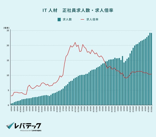 「日本を、IT先進国に。」をビジョンに掲げるレバテック株式会社 ( https://levtech.jp/ ) は、「IT人材の正社員転職市場動向」を発表します。本記事では、レバテックのデータをもとに、IT人材の転職市場における需給の変化を公開します。