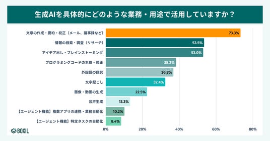 - 生成AIの活用用途として最も多いのは「文章作成・要約」(73.3%)
