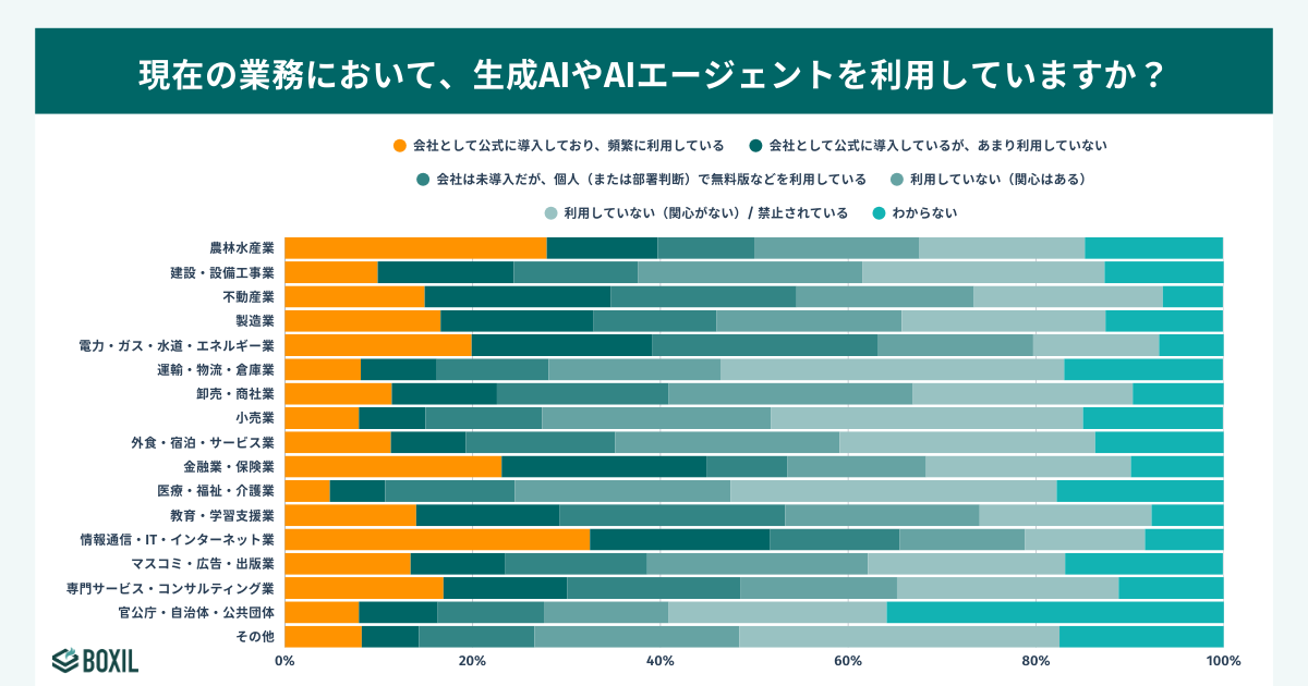 業種別では「情報通信・IT」(51.7%)、「金融・保険」(44.9%)が先行しています。一方で、公式導入が極めて遅れているのが「医療・福祉・介護業」(10.7%)や「官公庁・自治体」(16.3%)です。