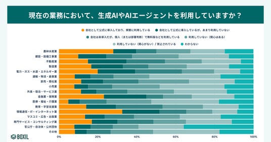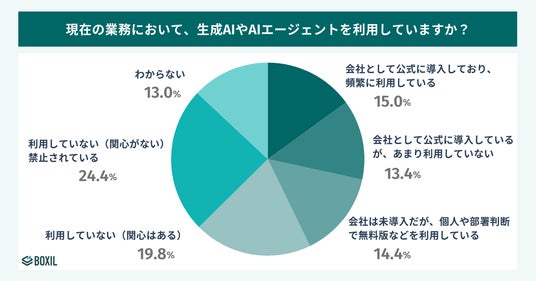 「現在の業務において、生成AIやAIエージェントを利用していますか」という質問に対し、「会社として公式に導入しており、頻繁に利用している」(15.0%)、「会社として公式に導入しているが、あまり使用していない」(13.4%)、「個人で無料版などを利用している」(14.4%)と回答した層の合計は42.8%に達ました。公式導入が28.4%に留まる一方で、ビジネス現場での実質的な利用率は4割を超えています。