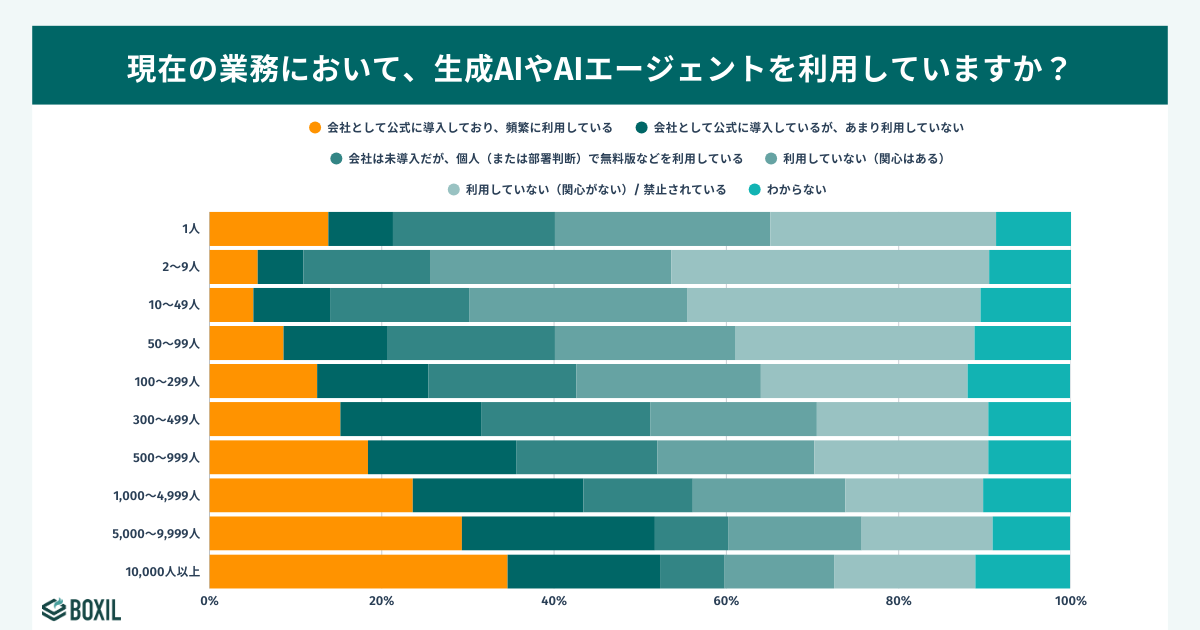生成AIやAIエージェントの導入状況を企業規模別に見ると、従業員1万人以上の大企業では52.3%に達しており、2社に1社が生成AI組織的な導入を完了させています。一方、小規模企業(10~49人)では、公式導入率(14.0%)を個人利用(16.2%)が上回っており、安全な環境が整備されないまま、現場のニーズが先行する「シャドーAI」が進んでいる実態が明らかになりました。