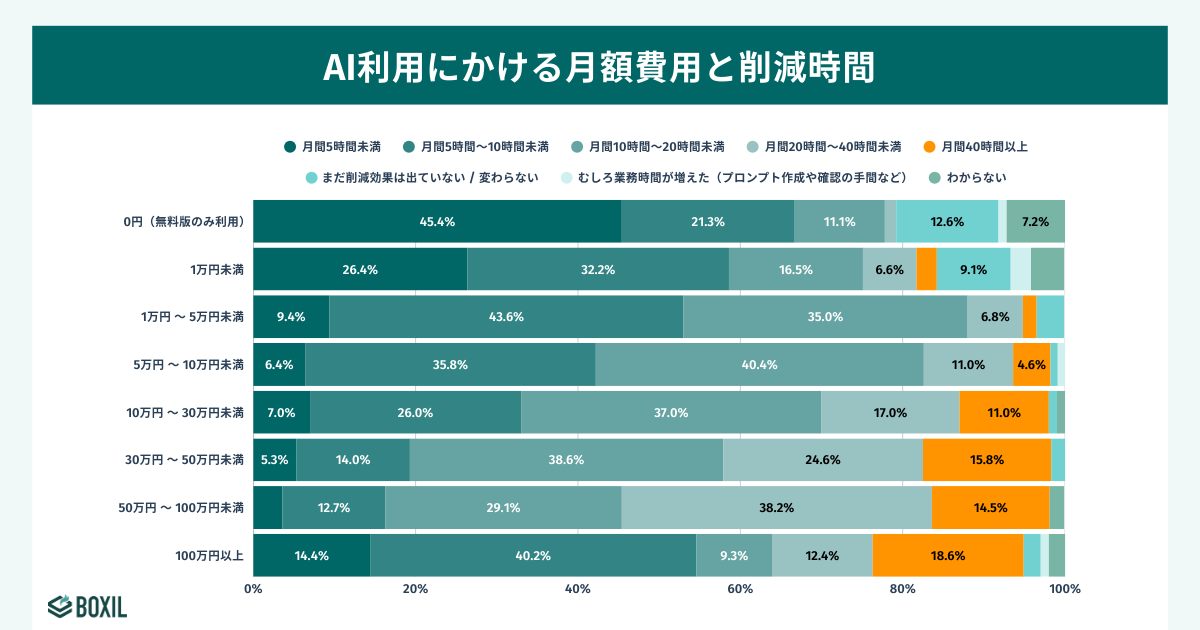 AI利用にかける月額費用と削減時間を分析したところ、費用0円(無料版のみ)の層で月40時間以上の削減に成功した人は0.0%でした。無料版利用者の45.4%は、月5時間未満のわずかな削減に留まっています。