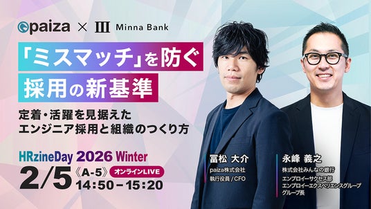 昨今の深刻なITエンジニア不足を受け、多くの企業が採用に苦戦しています。一方で、採用したエンジニアのミスマッチや早期離職といった課題も浮き彫りになっています。 paizaはこれまで、ITエンジニア向けの転職・就職・学習プラットフォームとして、4,900社を超える企業の採用・育成を支援してまいりました。今回の「HRzine Day 2026 Winter」では、これまでに蓄積したデータと知見をもとに、変化の激しい時代において定着・活躍を見据えたエンジニア採用と組織のつくり方についてお話します。