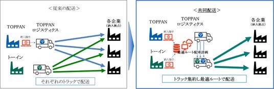 TOPPANとトーインが両社の製造拠点で生産する食品・日用品・化粧品などの包装資材について、TOPPANロジスティクスが物流全体の最適化を行うことで共同配送を実施します。